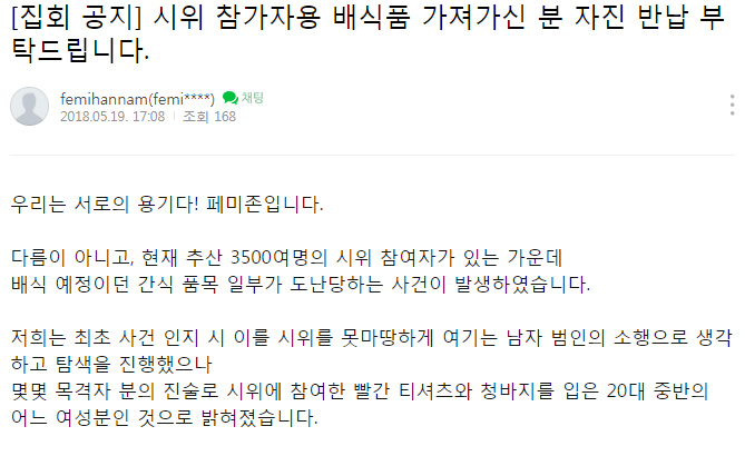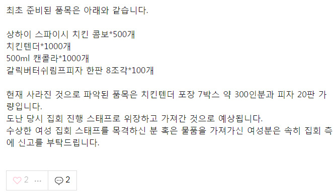 워렌스판말대로 집행부 라인에서 빼갓거나 아니면 저거 시위가는 애들 여럿이 모여서 같이 먹튀한거지. 피자 20박스는 건장한 남자도 2~3명은 있어야 빼돌리는게 가능한건데