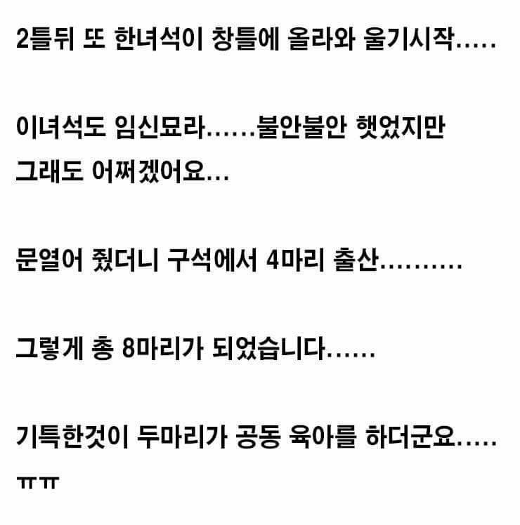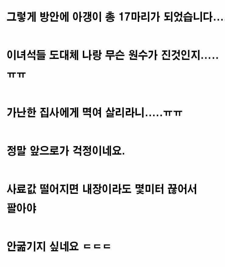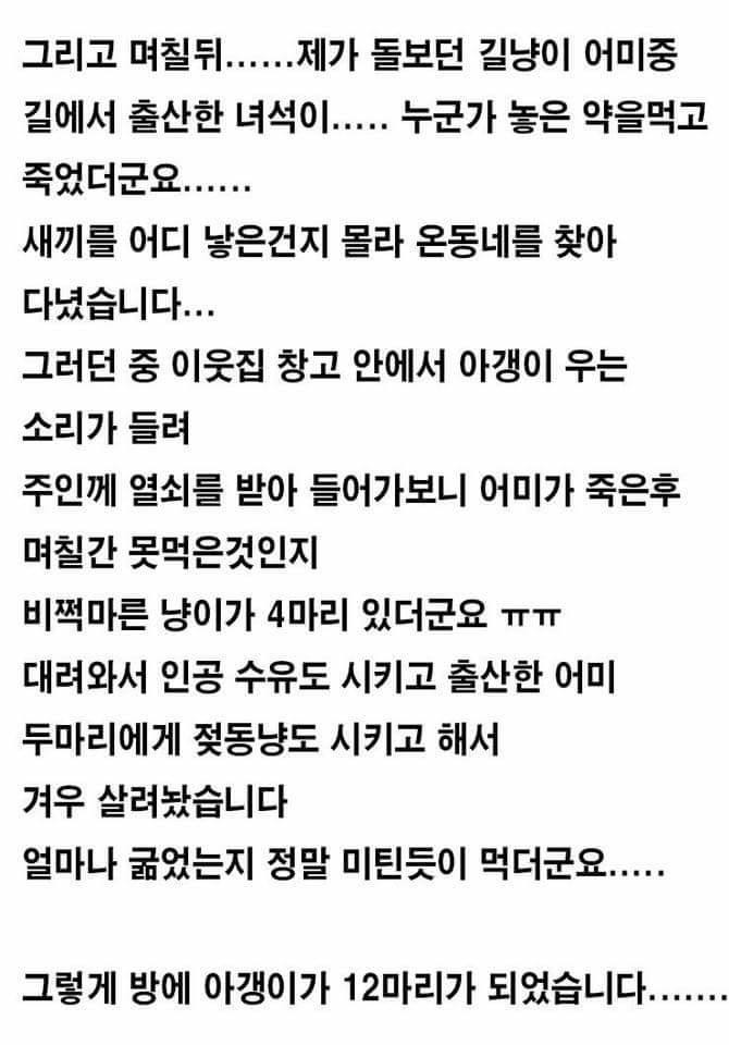 착하네 근데 고양이 4마리키우는집에도 냄새 쩔던데 저긴 장난아니겠다 ㄷㄷ