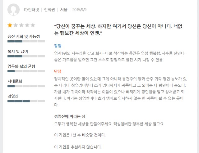 등등 이루 말할 수 없습니다. 저는 지금 이 사태가 밖에서는 여왕이라 빨아주지 내부에선 사장이라 빨아주지 무소불위의 권력을 휘두르며 안하무인 오만방자하게 행동했던 것들 모두가 지금 부메랑으로 돌아와서 벌어진 일이라 생각합니다. 직원들 연봉과 평가가 주먹구구식으로 진행되는 것을 체계화하여 조직정비를 하려고 했던 사람을 빨갱이, 반란군이라 몰아세워 쫒아내고 직원들 다 있는데 특정 직원을 지목하여 무능력한 놈이라 깎아내리는 행동하며 회사에서 밤 늦게까지 이어지는 술 파티에 다음 날 가족행사 있다고 늦게까지 술 자리 못 있겠다고 말해도 난 모르겠으니까 사장님한테 알아서 말하고 처신하라고 말해줬었던 이XX 상무이사님 이게 회사에요? 그냥 회사놀이 하는거지. 한편으로는 이해합니다. 사장 눈치 보느라 그랬던 거. 근데 그거 제 눈에는 사장이나 경영진이나 그 나물에 그 밥같네요. 이런 회사는 망해버려야 합니다. 그래야만 합니다. 경쟁자 없다고 배가 불러서 직원들한테 열정 페이나 시키고 맨날 업계 최고 이러는데 대우는 업계 바닥 수준. 지금 이 사태에 대해 인벤은 손바닥으로 하늘을 가리는 듯한 행태를 하고 있는데 외부단속 하기전에 내부단속부터 하세요. 직원을 일회용품 다루듯이 하지말고. 오죽하면 잡플래닛 평가가 이렇게 안좋을까.. 내가 누군지 조사해서 알아내기 전에 왜 이와같은 일이 벌어졌는지 반성부터 하세요. 이런 글 적을 퇴사한 직원들이 한트럭이라는 건 알고있죠?