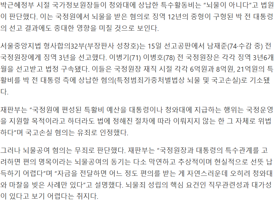 에 그러니까 직무관련없고 대가성 없이 받은건 뇌물이 아니니 뇌물죄가 아니라...