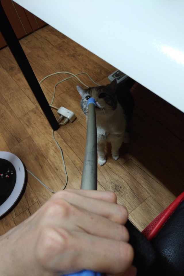 밤새 야옹해서 혼낼라고 몽딩이 들었는데 몽딩이 장난감인줄알고 노는중