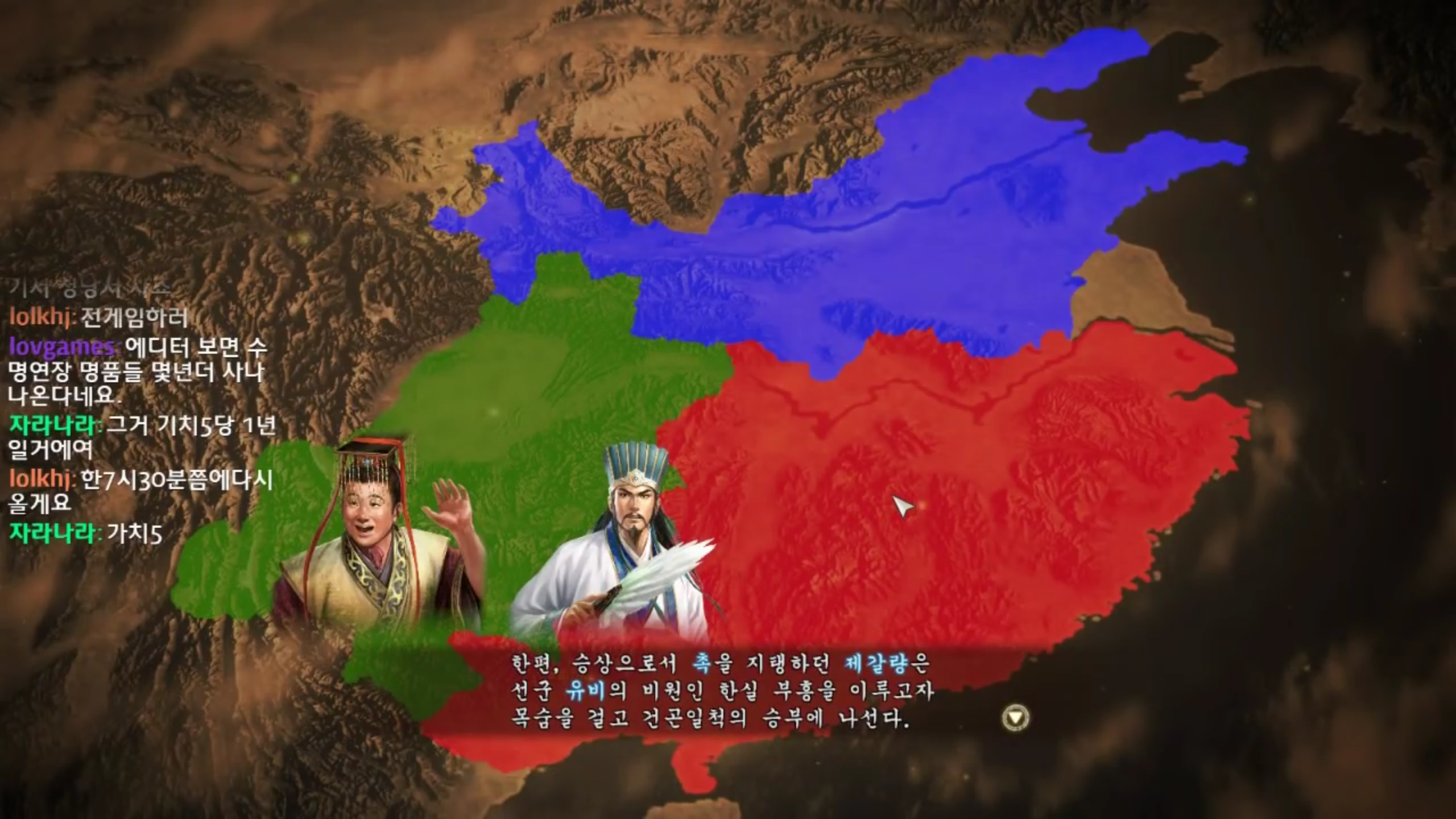 촉의 평지는 사실상 색칠해둔부분이 전부이고 나머진 그냥 산지임. 저 상태는 형주공방전에서 남형주를 오나라가 먹은경우라 위기준 촉의 땅크기나 인구수등 경쟁력은 8분의1남짓수준