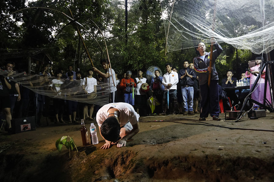 6월 26일 동굴 입구에서 실종된 소년의 가족들이 기도하고 있다