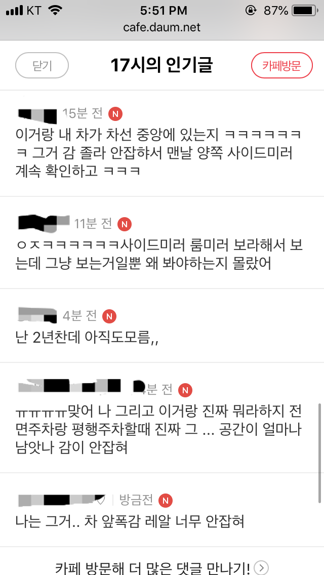 ㅇㅇ 사실 주차 어려운건 초보면 누구나 어려운건데 차 폭 거리재는것도 그렇고 운전 익숙하지 않으면 어렵지