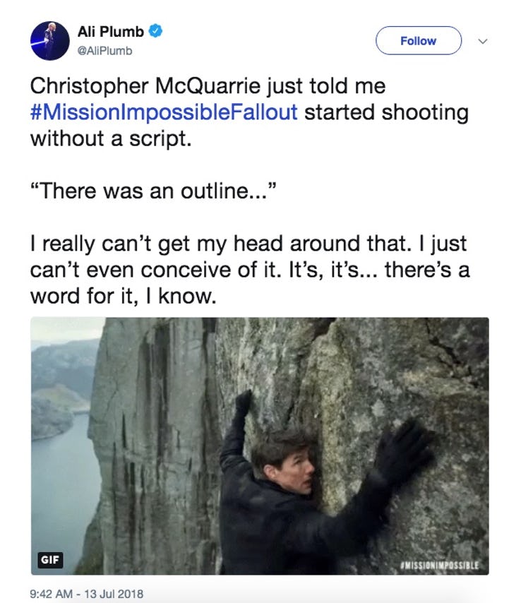 감독인 크리스토퍼 맥쿼리에 따르면 미션 임파서블 폴아웃은 최종 각본없이 촬영이 시작되었다고 합니다.