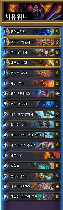 평범한 치유위니에서 잿멍울 2장->아르거스로 교체하고 파멸의수호병 다 빼고 암불,리로이로 대체한거