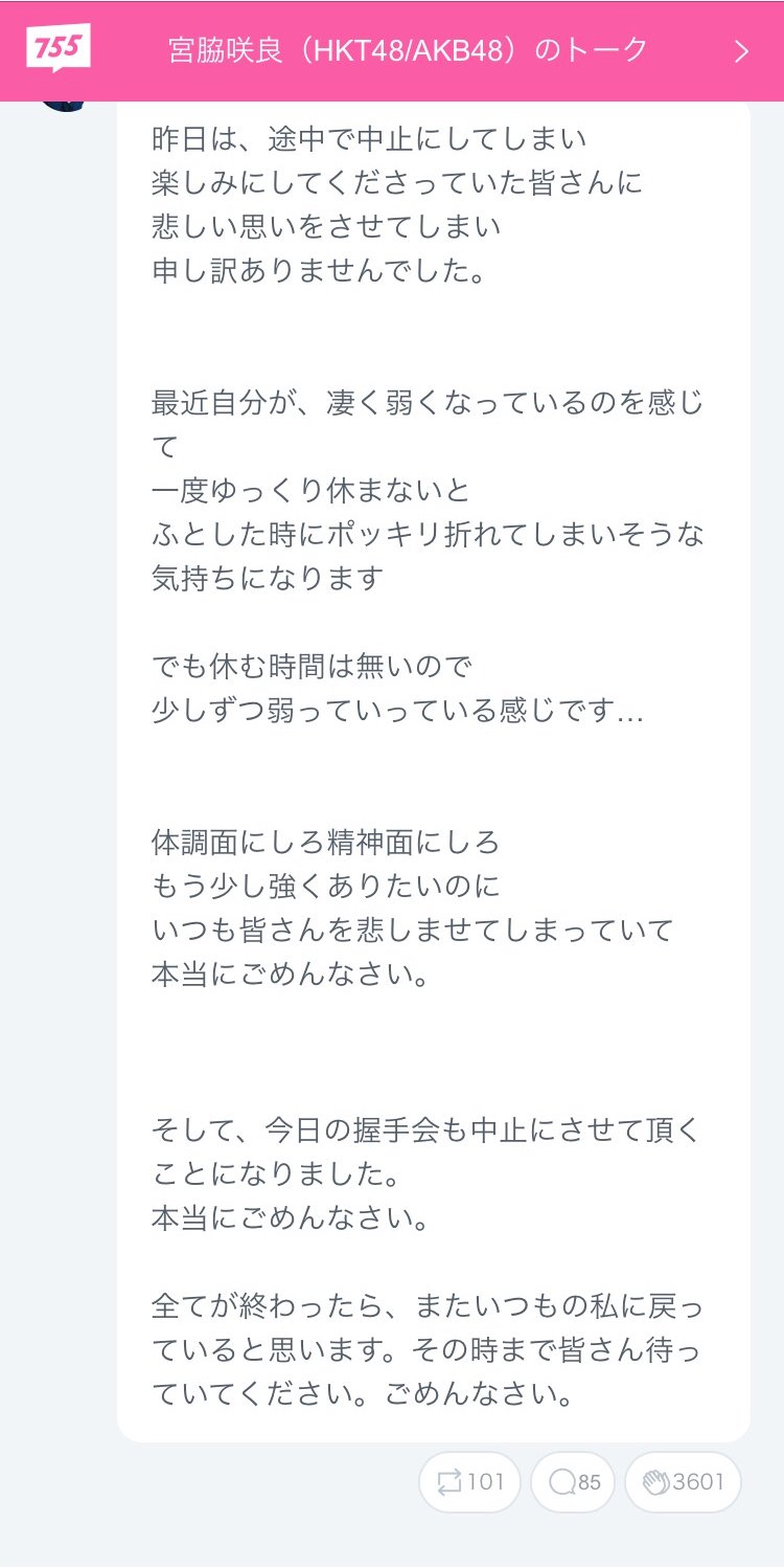 사쿠라가 어제에 이어 오늘도 악수회 컨디션 불량으로 진행 못하겠다고 띄운 메시지.