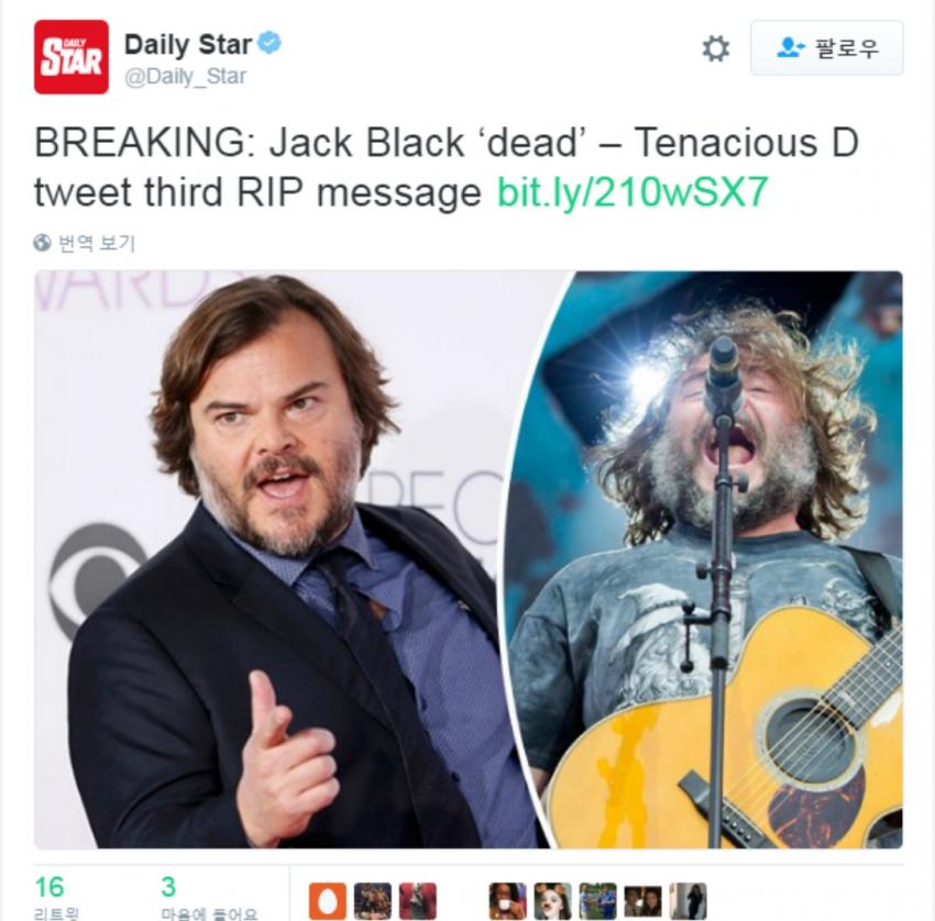 잭블랙 사망설 꽤 오래전에 돌고 구라로 나온 거 아닌가