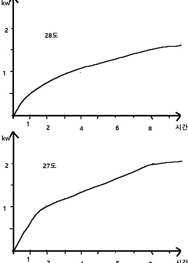 27도는 28도 때보다 1도를 초반에 더 내려야되서 전력 사용이 2시간동안 약 1.5배 더 차이가 나는데