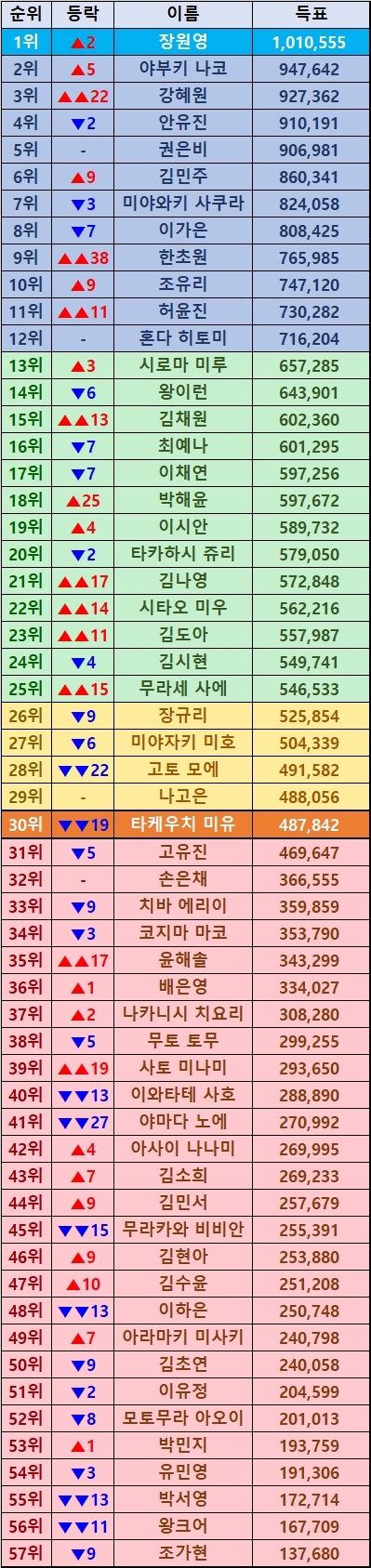 기존 상위권들에서 장원영, 나코, 안유진, 권은비 이 정도는 계속 유지 가능할 거 같은데