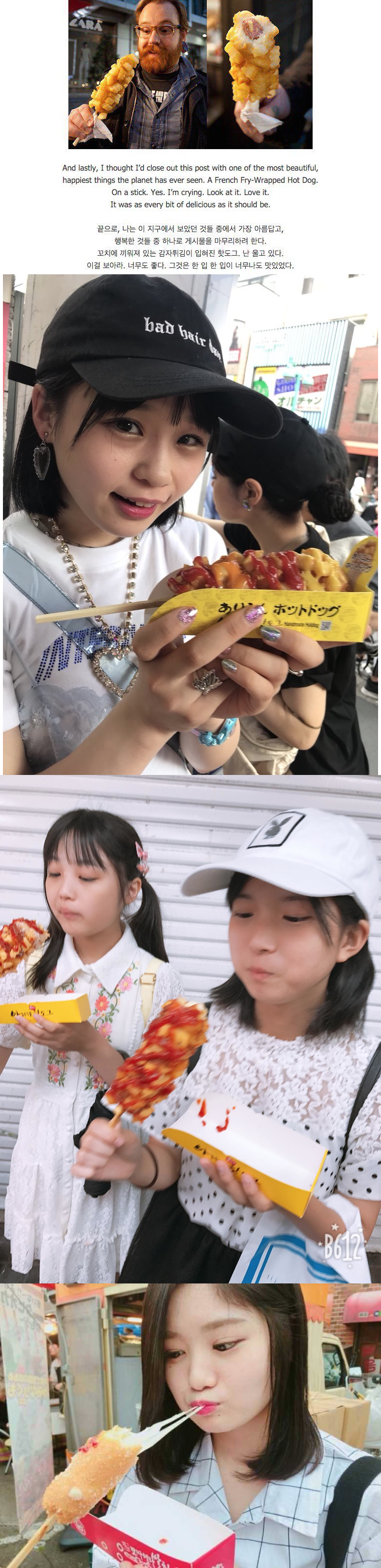 우린 저거나 빵에 소세지 끼운거나 둘다 핫도그라고 하지만 영어에선 저건 corn dog라고 따로 구분한다고 들은 것 같았는데 저 사람은 핫도그라고 쓰네