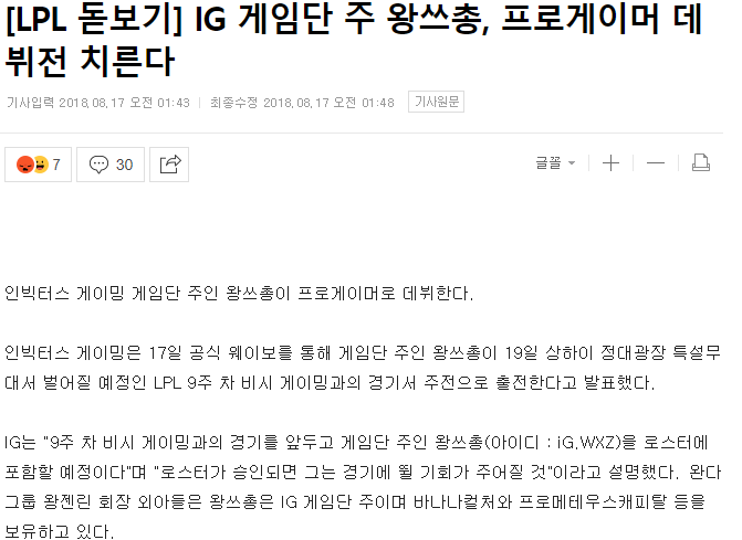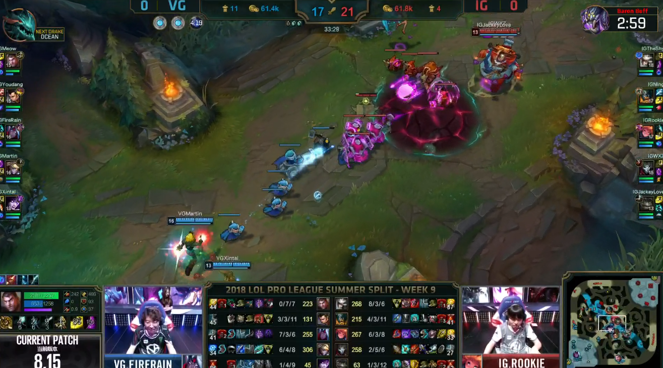 완다그룹 회장 외아들이자 IG구단주인 왕쓰총이가 IG 1위확정짓고 VG(한국BBQ급)과 경기에서 원딜로 출전. 기존원딜인 재키러브는 서폿행.