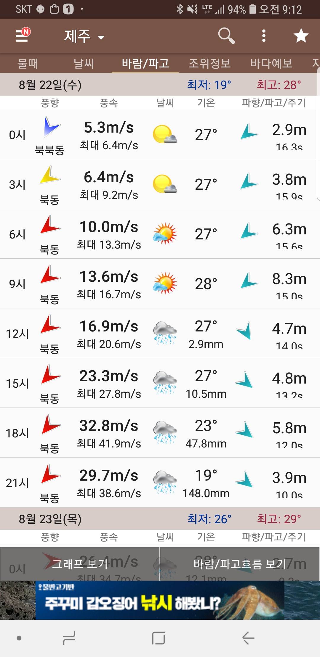 북동풍인거보면 태풍이 진짜 근처까지 왔단거네 호달달 ..