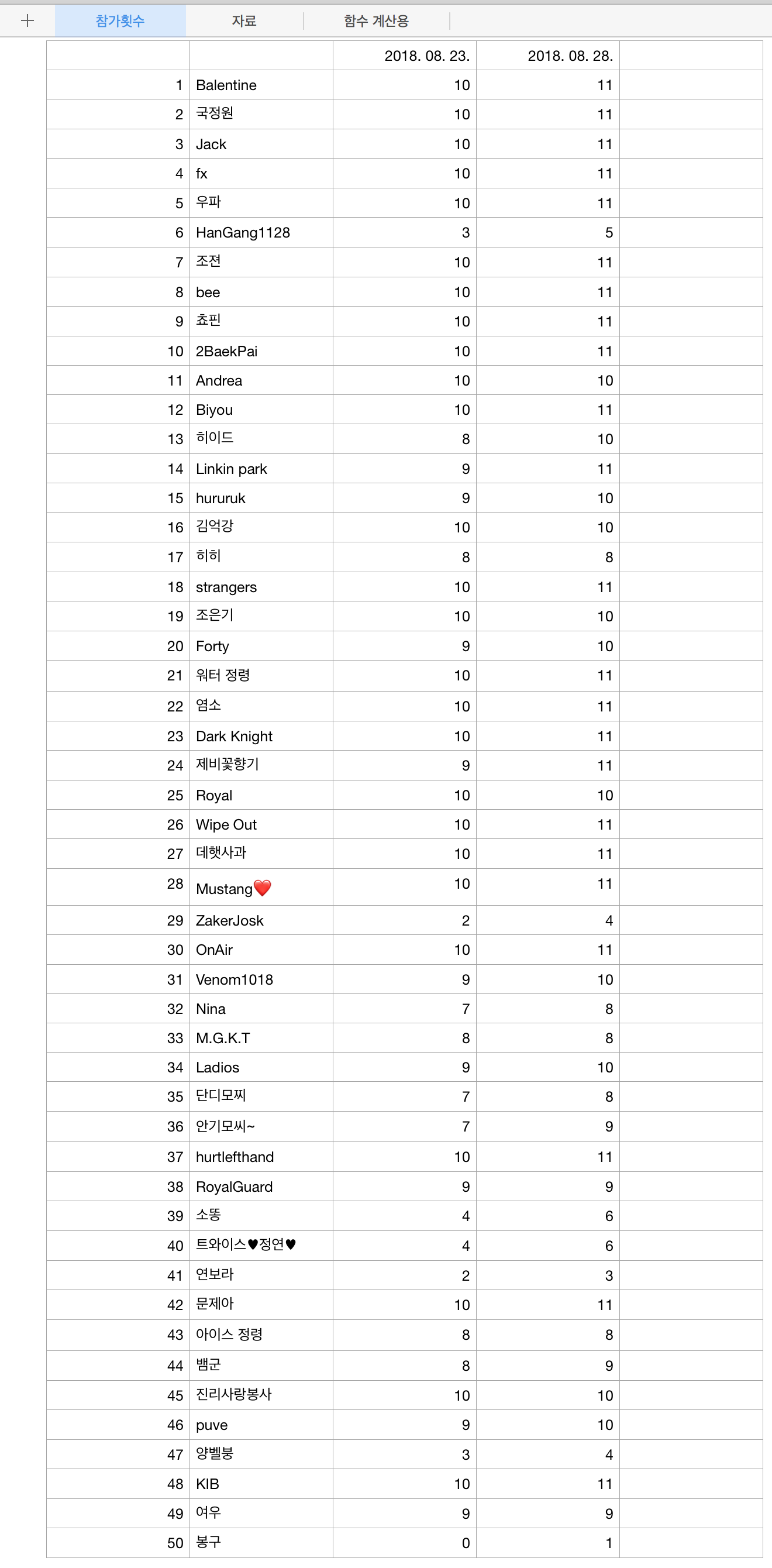 표가 이야기 하는 바는 최근 클랜전 참가 횟수