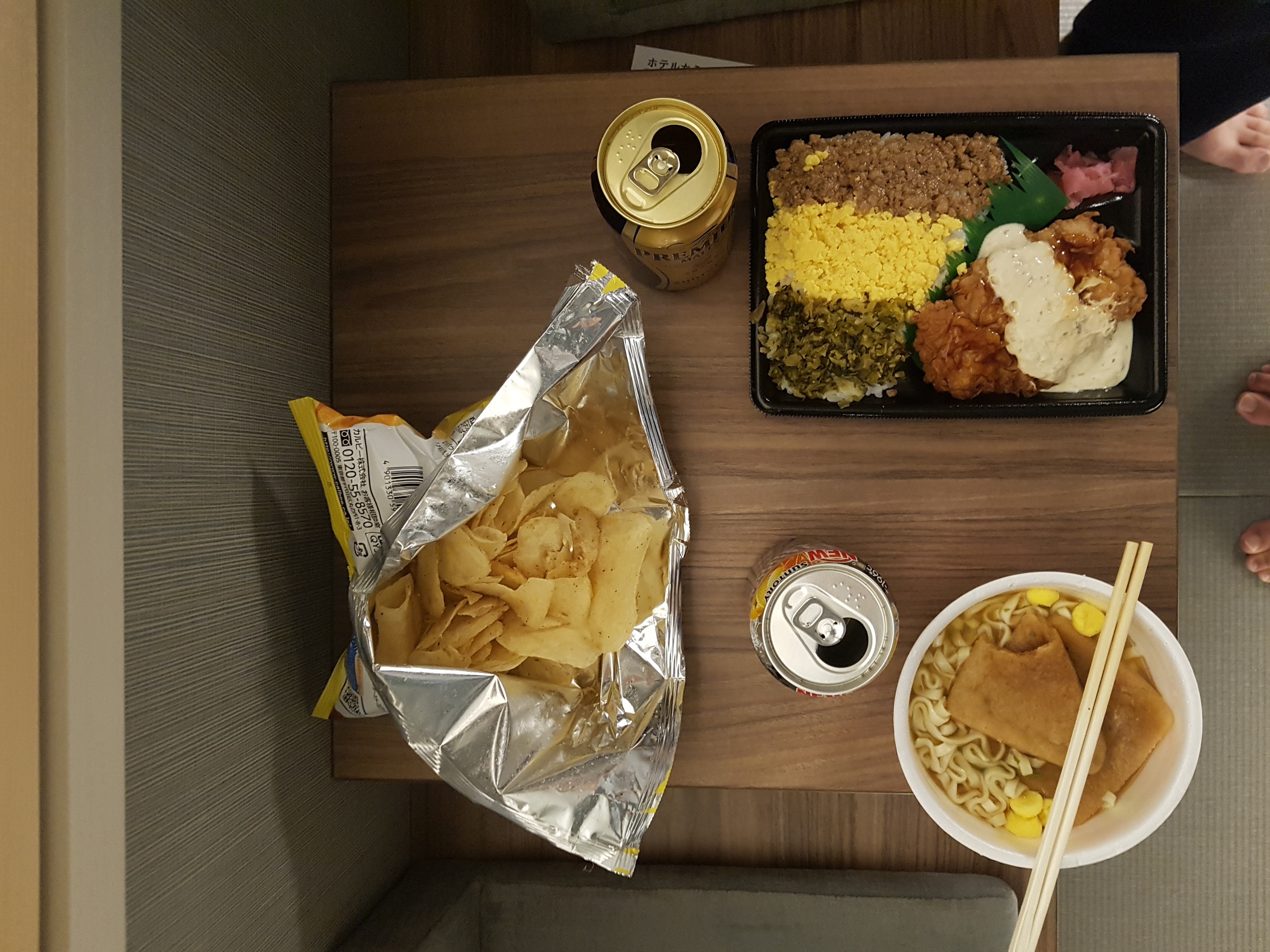 유부우동이랑 치킨까쓰있는 편의점 도시락이랑 허니버터칩하고 맥주..는 아니고 과일주일듯.