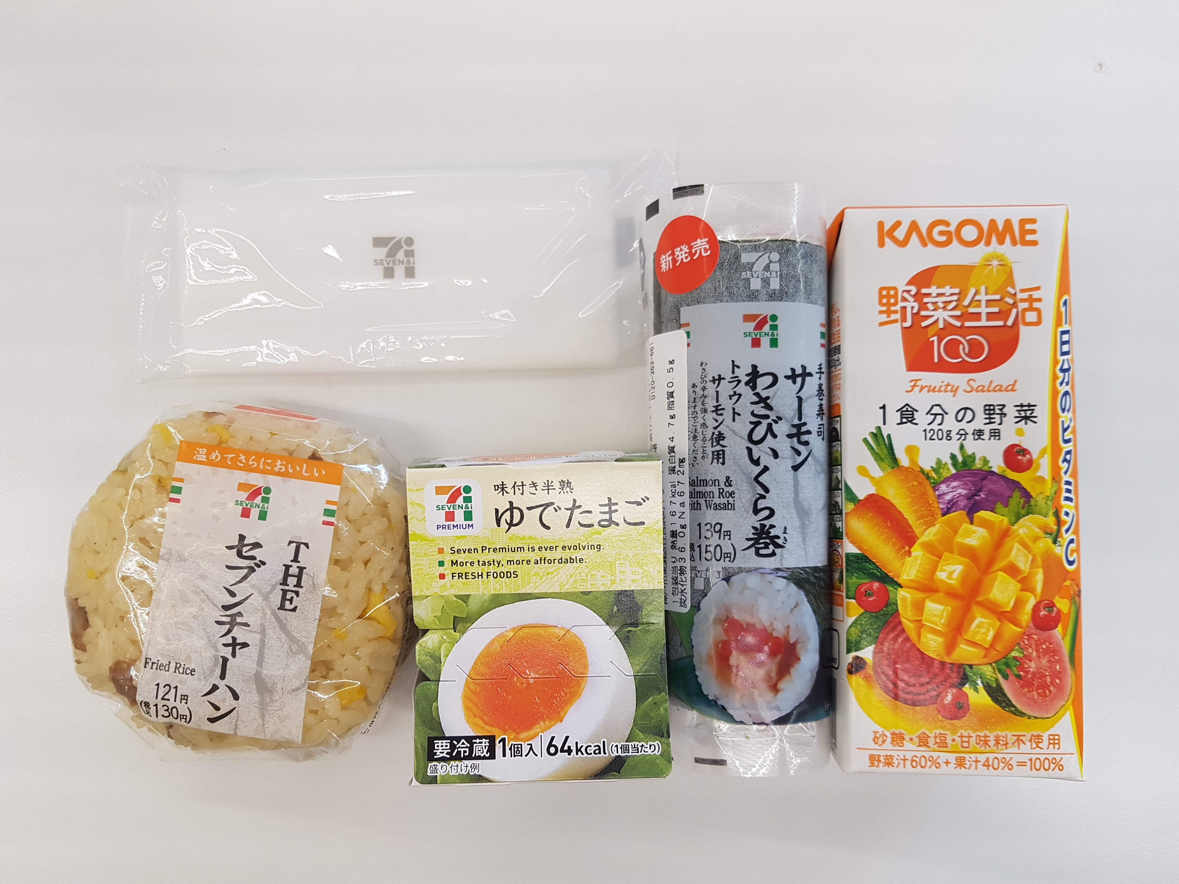 왼쪽부터 볶음밥 뭉쳐놓은거. 반숙계란. 연어알이랑 와사비랑 뭐들어있던 김밥. 이상한 과채주스