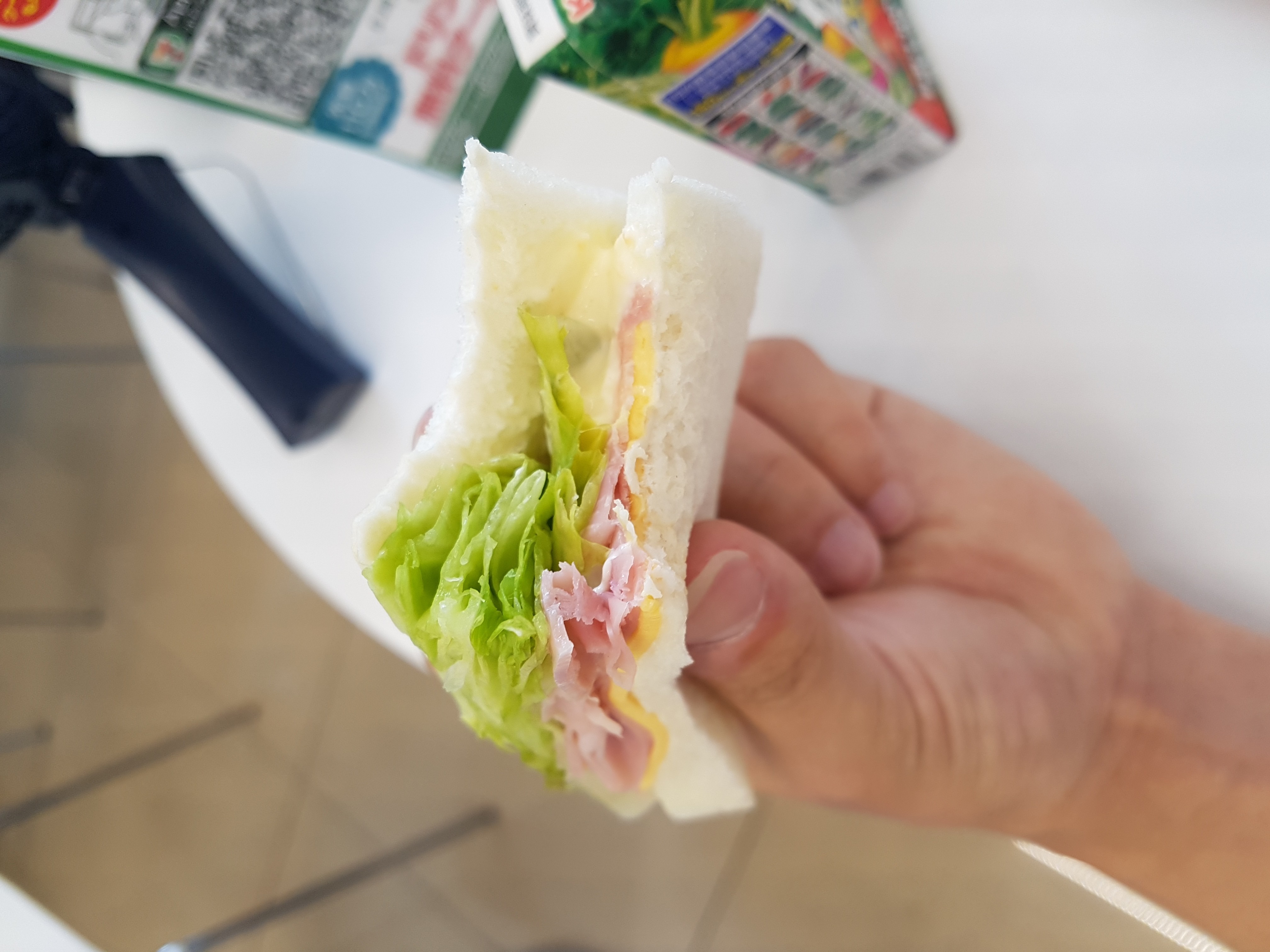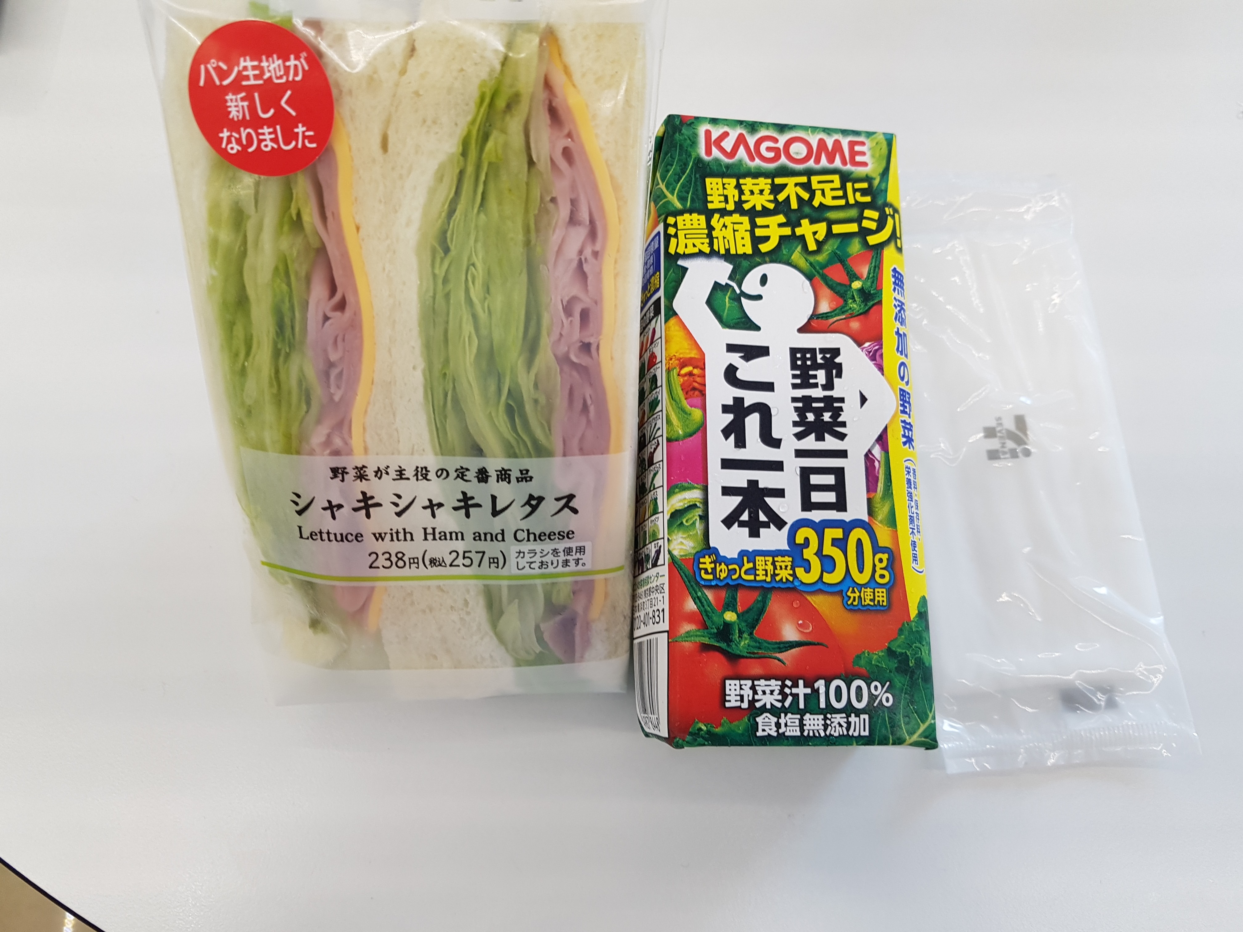 교토가기전 아침에 먹은 편의점 샌드위치와 야채쥬스.