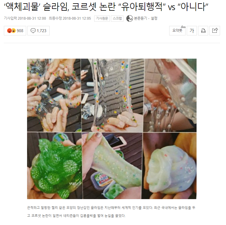 액체괴물로 알려진 '슬라임'이 코르셋 논란에 휩싸였다. 끈적하고 말랑한 젤리 같은 모양의 장난감인 슬라임은 지난해 세계적 인기를 모았고 국내에서는 가수 아이유가 갖고 노는 모습이 화제가 됐다. 하지만 최근 사회가 원하는 여성상을 거부하는 탈코르셋 열풍이 불면서 슬라임도 코르셋의 일환이라며 이를 갖고 놀지 말자는 주장이 제기돼 인터넷상에서 갑론을박이 벌어졌다.