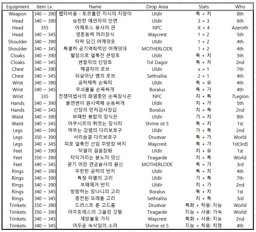 앞으로 내가 격아하면서 사용하게 될 1티어 장비들을 엑셀로 정리중인데(월돚중)