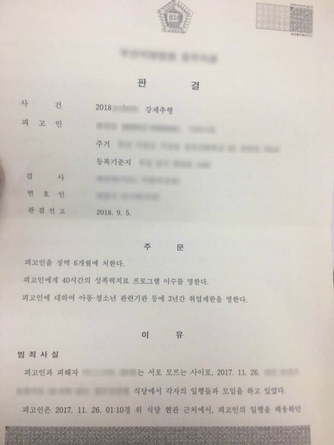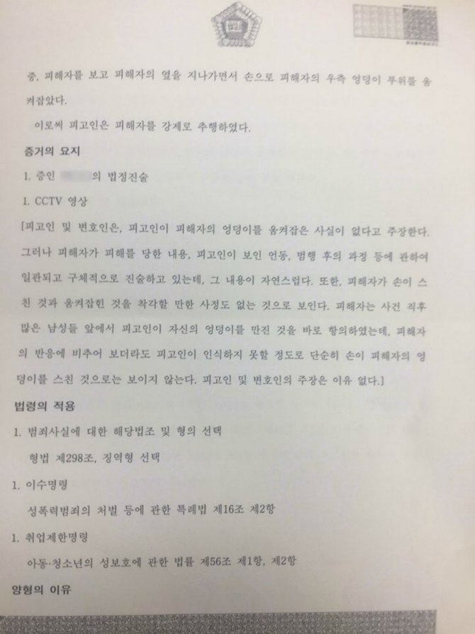내 보기에 움켜 잡았을 수도 있고 아닐 가능성도 있어 보임 근데 아무런 물적 증거 증인 없이 피해자 증언만으로 징역 6개월은 좀 심하다 방법은 역시 펜스룰 나처럼 사람이 붐빌 땐 손을 모으고 가슴에 붙이고 다녀야한다.