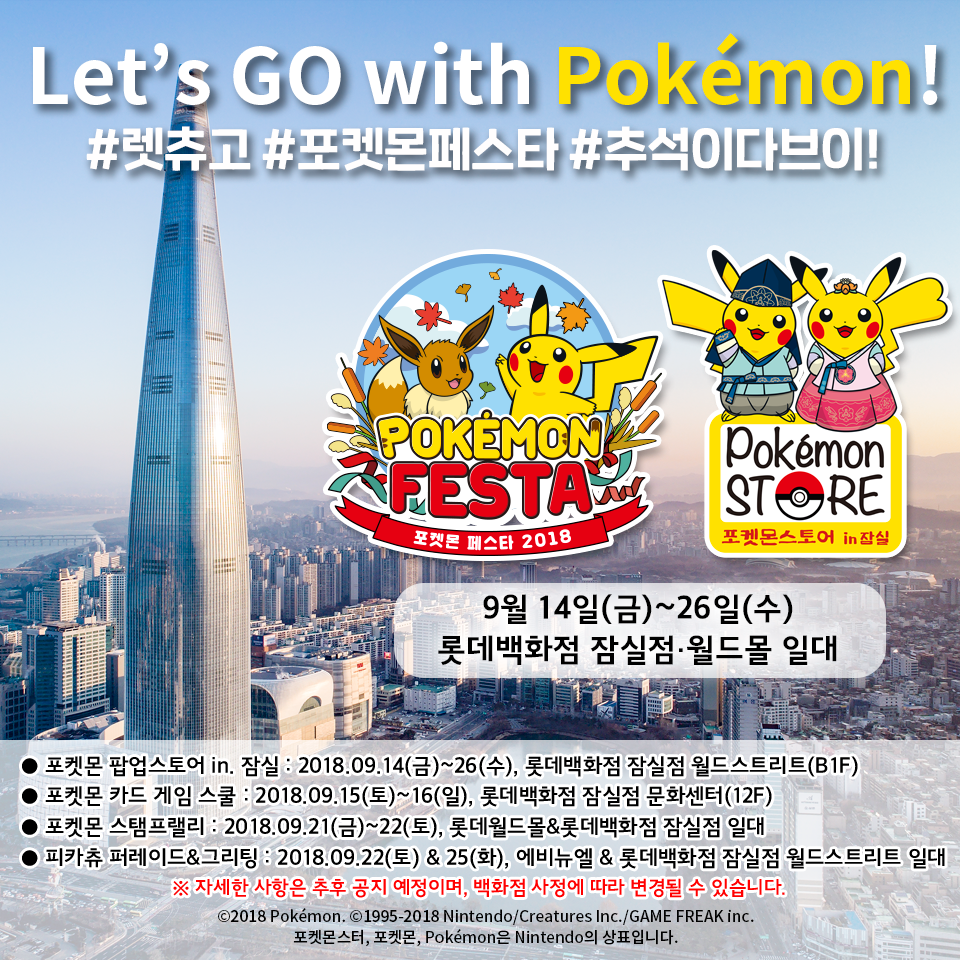 ㈜포켓몬코리아가 주최하는 “Pokémon FESTA”가 9월 14일(금) ~ 9월 26일(수) 까지 서울 잠실에서 개최됩니다. 이 이벤트 기간 내의 일주일간 (9월 17일 ~ 9월 25일) 한국의 전 지역(일부 지역 제외)에서 평소보다 포켓몬의 출현 확률이 더 높아질 예정입니다!