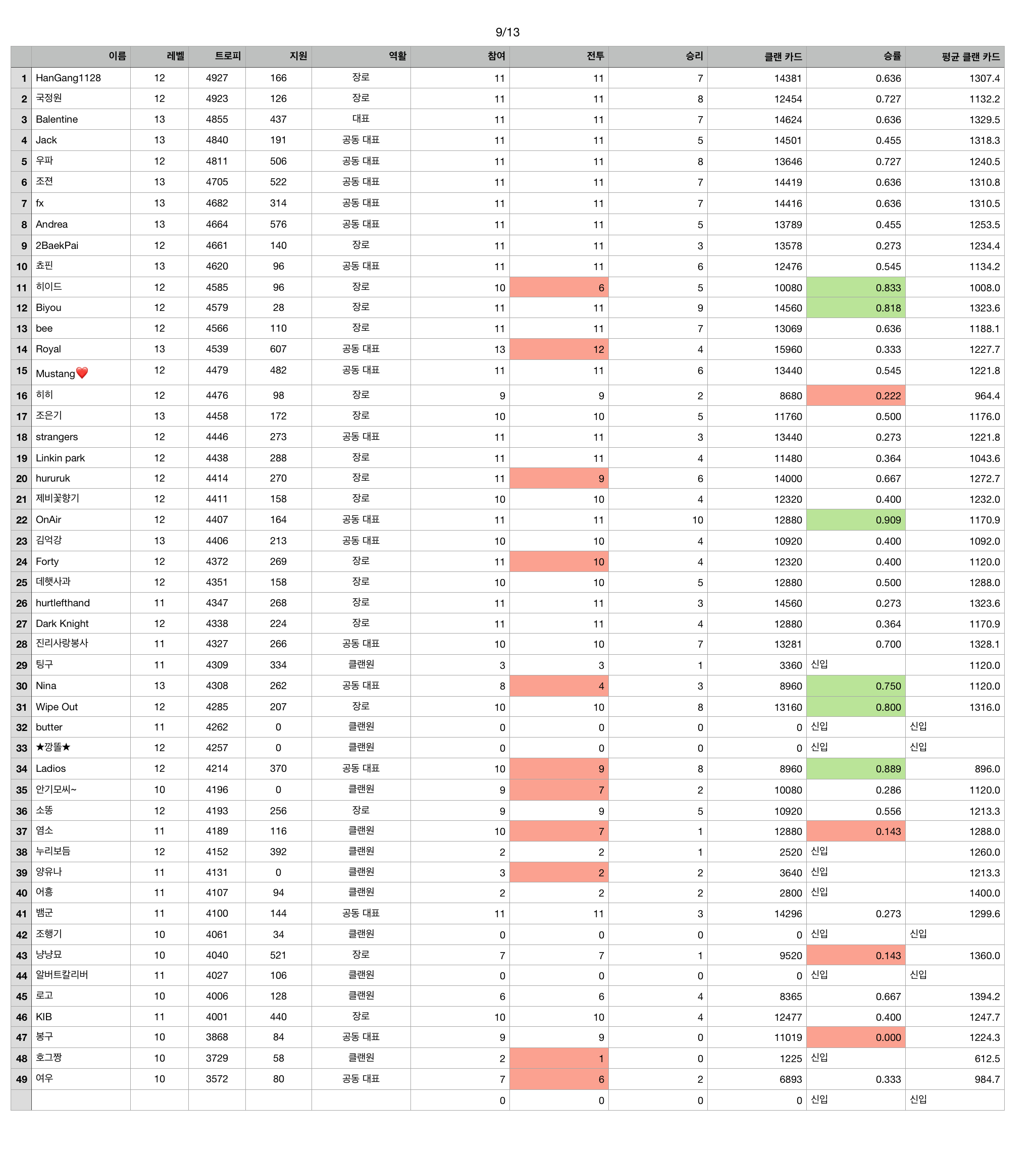 카드획득은 그럭저럭 평균치라고 생각하지만 승률부분은 몇명 자르고 싶네