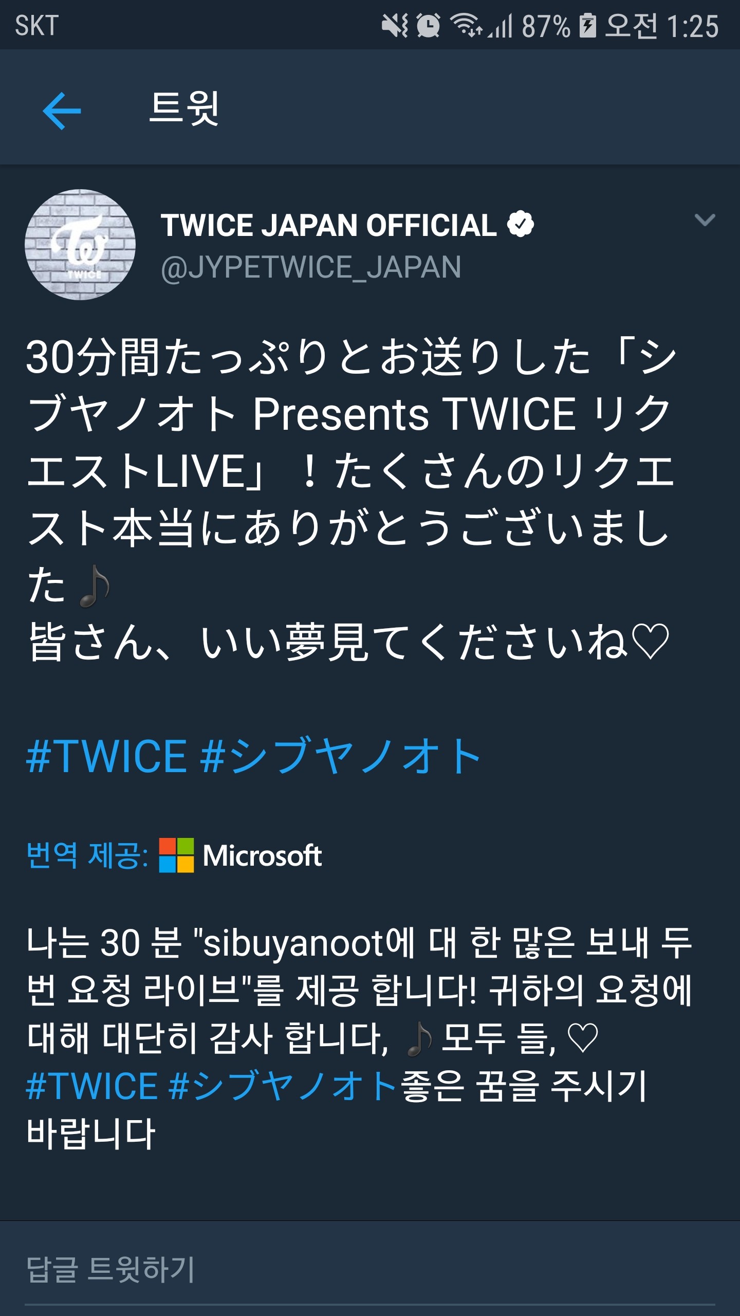 방송 끝나고 올라온 시부야노오토 트윗과 일본 공트.