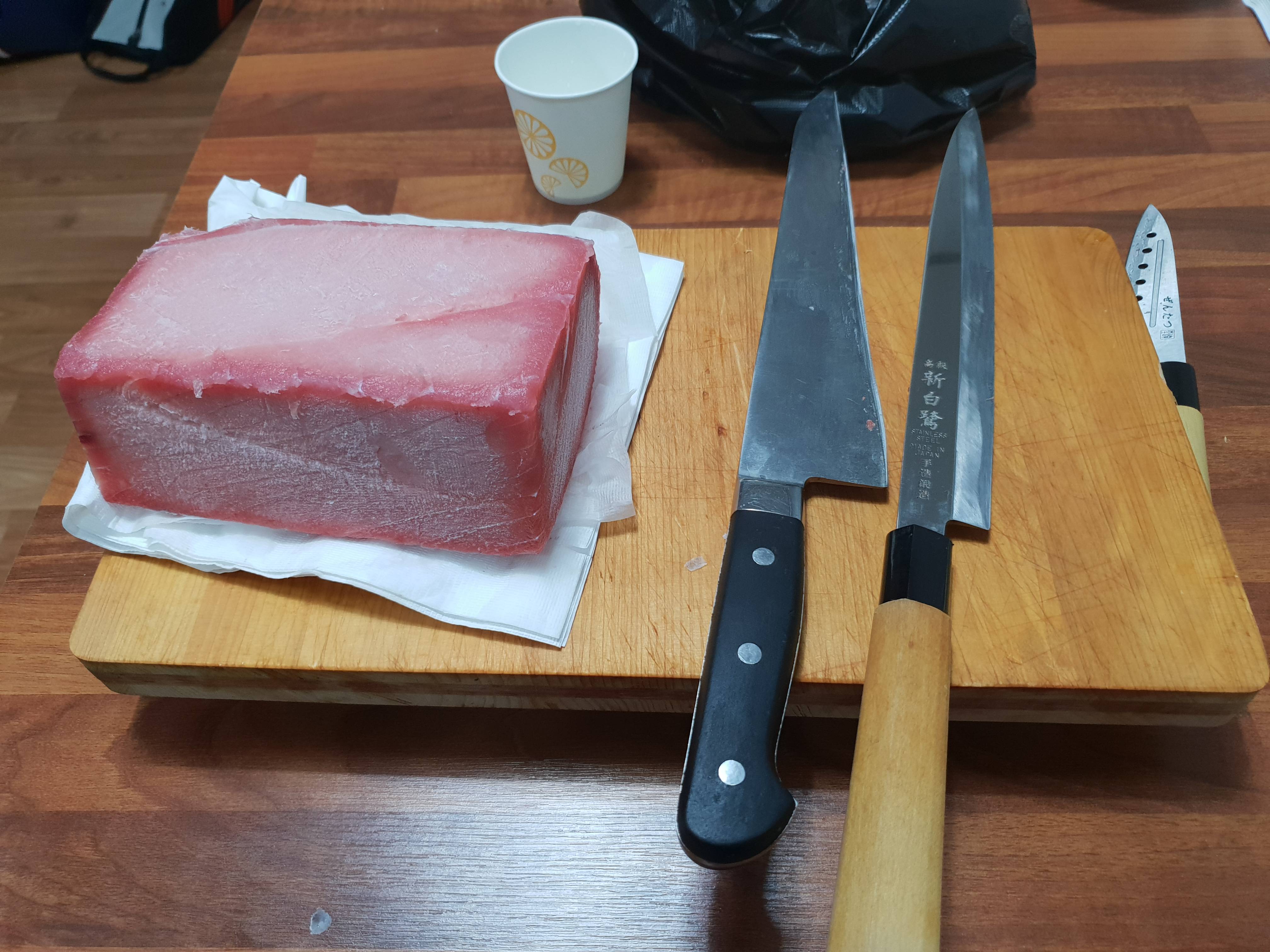 서울에서 저거하고싶으면 인터넷에서 냉동참치 사면됨 아이스포장해서 날라옴 아니면 노량진가면 바로 살수있고. 참치 제대로 못녹이면 비림 녹이는게 포인트 자르는건 대충잘라도 존맛