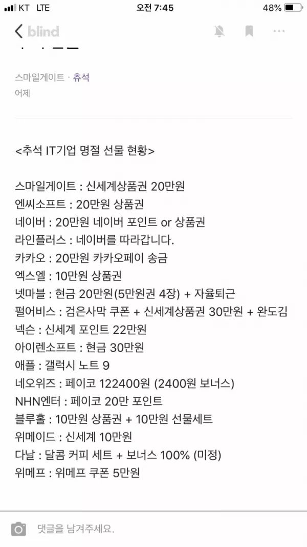 이거 추석전에 생긴 게시물인데 엔씨 전사원 200받음