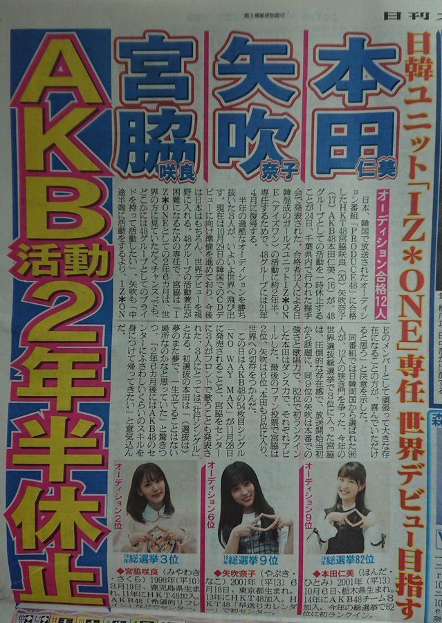 샄낰히 3명 모두 아이즈원으로 활동하는 2년 6개월 동안 전면적으로 akb 활동은 휴지하는 걸로 결정.