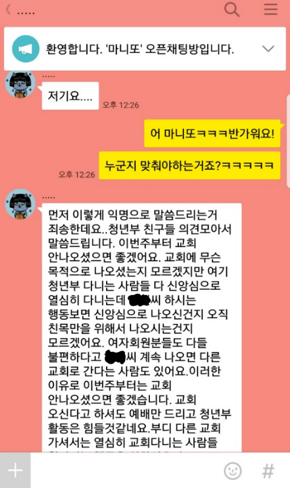얼마나 진상짓을 했으면 교회에서 먼저 내보낼까 그와중에 대놓고 말할 자신 없어서 익명으로 말하는애도 참