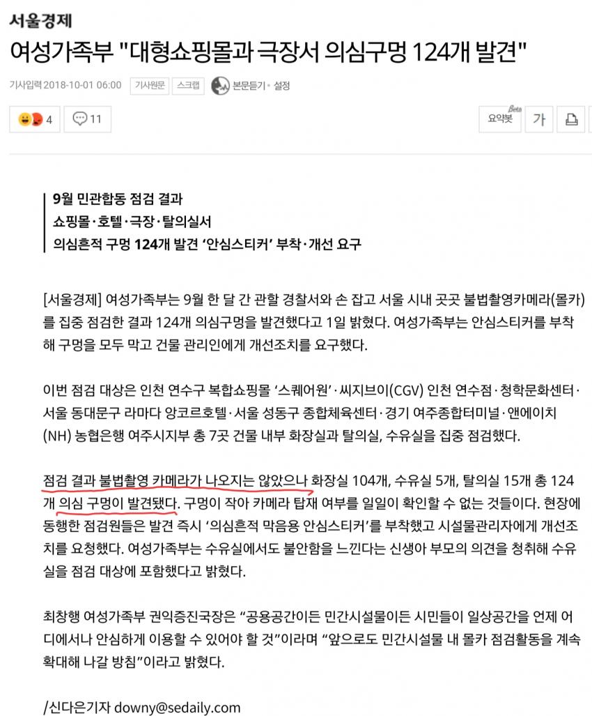 한달간 7곳 조사해서 124개 발견했으면 그냥 우리 일 존나 귀찮았는데 발견은 못하고 그렇다고 불법촬영 없어요 할 수는 없으니 의심구멍!!! 구녕있다!! 이러면서 개지랄 하는거지.