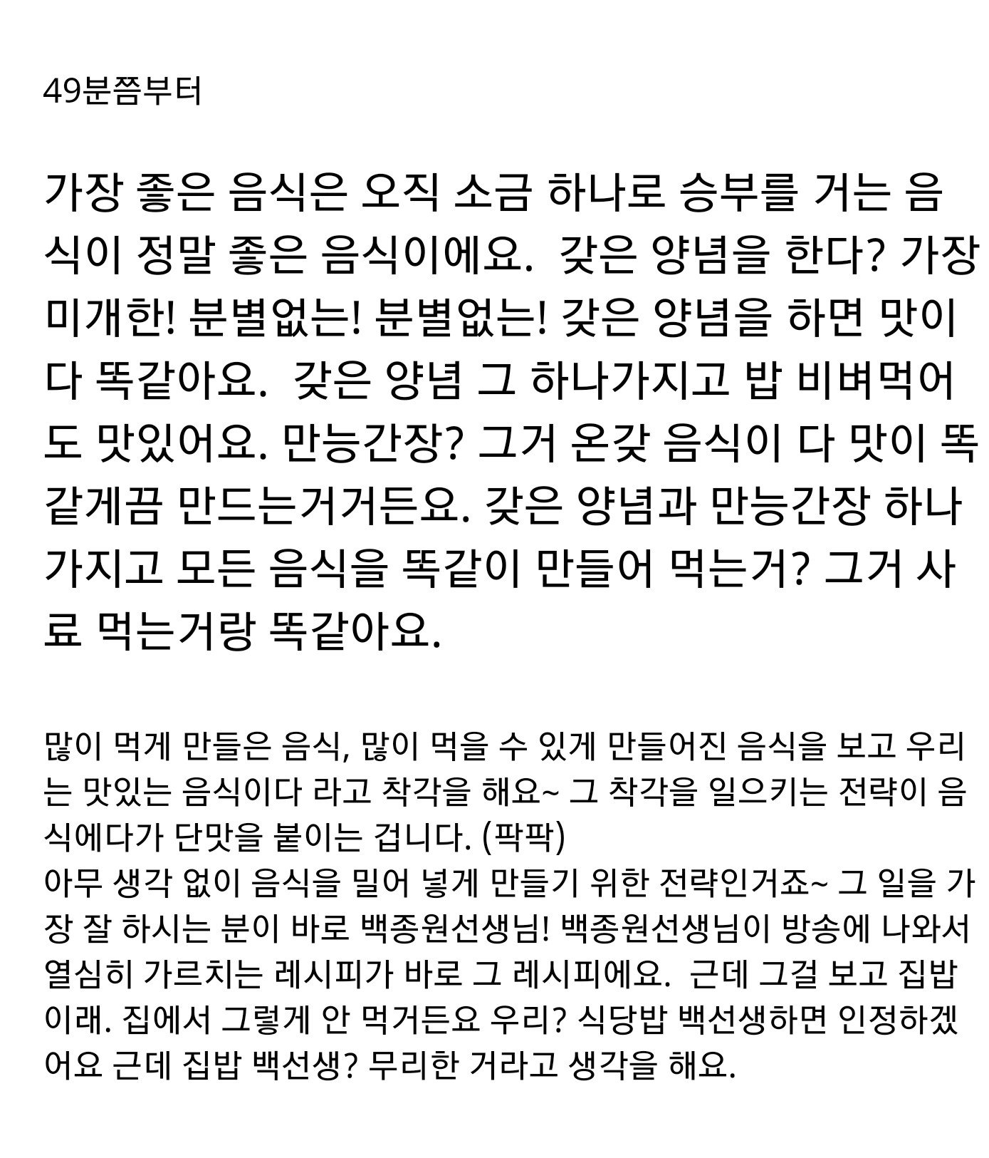 저 황교익이 말하는게 딱 그런스타일임. 일본식의 재료에 최소한의 가공만 더해서 먹는것이 가장 좋은 방법이고, 이런 저런 양념을 쓰는건 재료본연의 맛을 해치고, 재료자체의 허접함을 가리려는 수단일 뿐이다.
