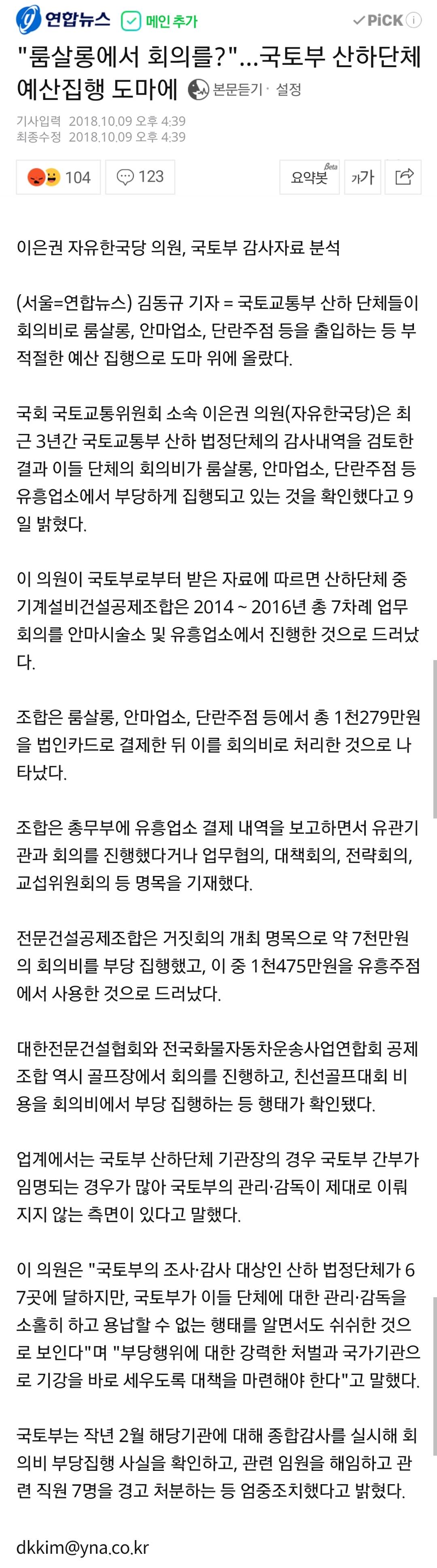 저런건 원래 여당도 많이 잡는데 국회가 행정부 견제하는게 국감인데 여당이라고 봐주는것도 웃기지. 그래주면 공뭔이야 고맙지만 건설중기계 어쩌고하는걸로 봐서 노가다꾼들이 어디 협회만들어서 노가다뛸때 버릇 못버리고 업소출입했구만 미친새끼들