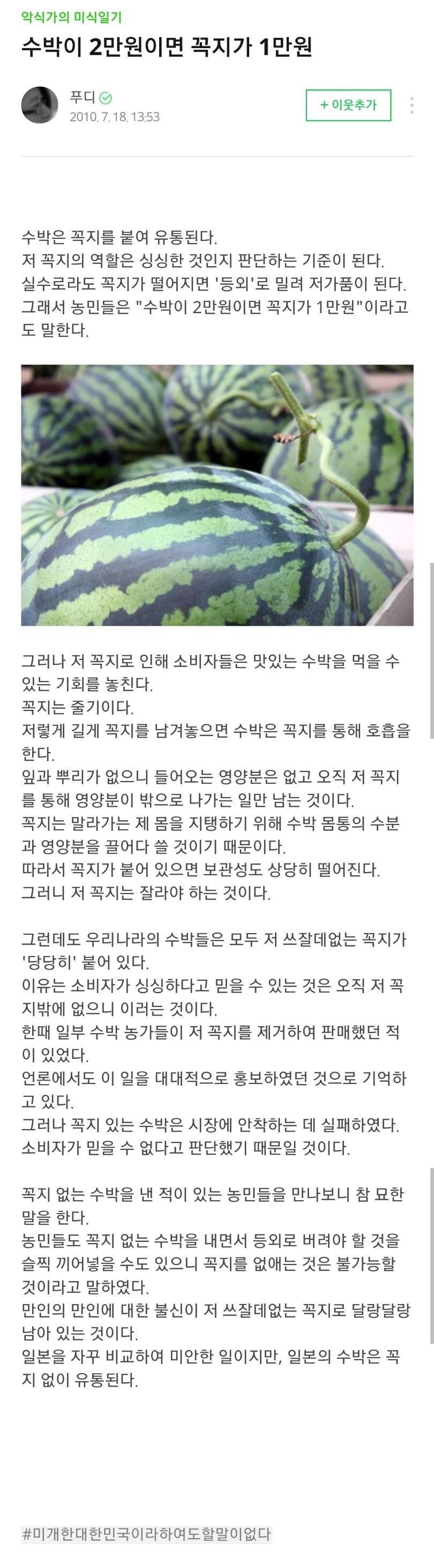 난 저거 수박살때 소비자들이 꼭지 없는거 선호안한다는거 처음알았다 난 신경도 안썼는데 걍 두들겨보고 샀는데 실퍄한적 없음 어차피 맛없는 과일은 내가 선별한다고 거를수 있는게 아니라 아예 그 가게를 안가야함. 마트표는 대충골라도 맛있더만