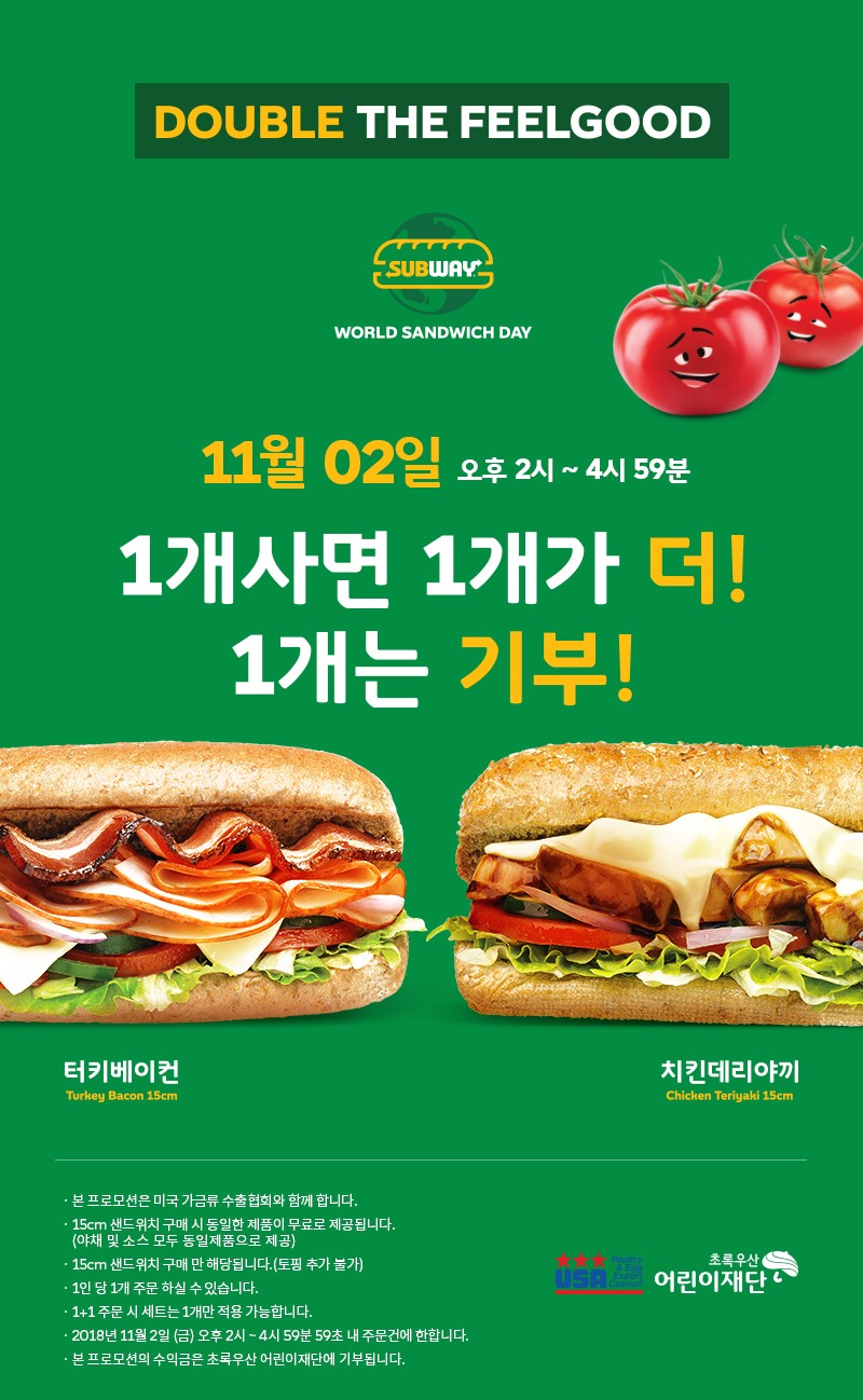 서브웨이에서 오는 11월 2일 오후2시부터 오후4시59분까지 1+1 행사를 한다고 합니다.