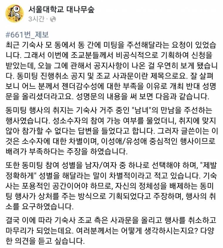 그럼 이건 이성간 미팅이니 그대로하고 젠더감수성 넘치시는 분들만 따로 자리를 마련하는 행사를 진행하면되지 그걸 취소를 시키네