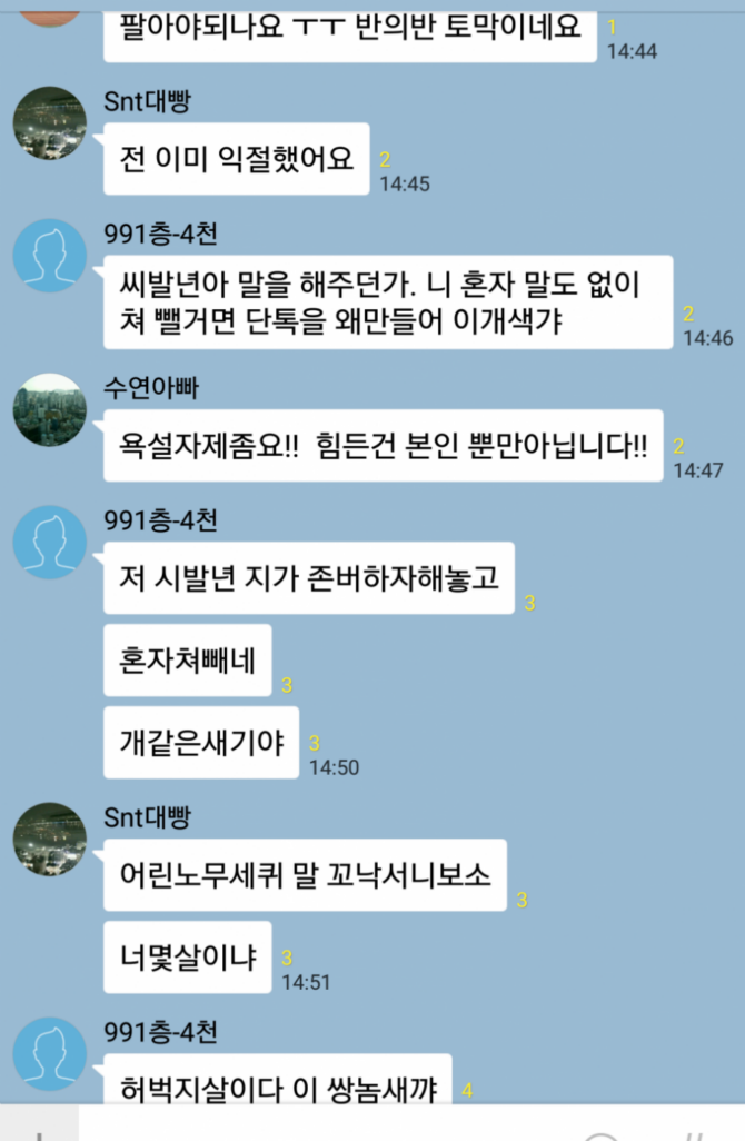 교민방에 새벽 5시부터 쌈났넼ㅋㅋ 누가 코인 조졌다고 한탄하니까 새벽 5신데 도박 얘기는 딴데가서하라고 하니까 죽이네 살리네 시바 ㅋㅋㅋㅋㅋㅋㅋㅋㅋㅋㅋㅋㅋㅋㅋㅋ
