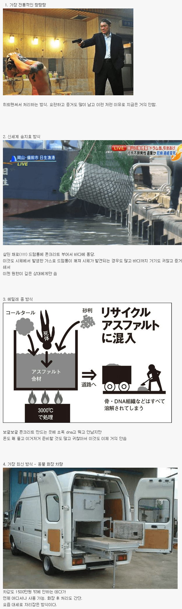 완벽한 시체유기는 사실상 매우 어렵당. 위에 나온 방법들도 최소 한가지씩은 처리 안되는 부분들이 있음. 예를들어 황산에 다 녹였는데 치아보철물 남아있어서 잡힌 범인이 실제로 있었지 ㅋㅋ 우발적으로 저질렀다면 그냥 자수하는게 속편할듯. 계획적이라면 여러가지 처리기구를 구비하기위해 돈세탁부터 해야할듯