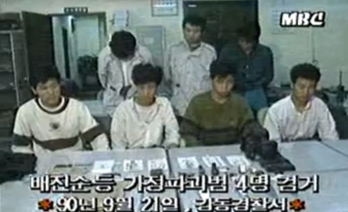 배진순·김철우·박영환·김권석(당시 나이 18~19세)은 1990년 6월, 서울 둔촌동에 살던 41살 강 모 씨의 집에 흉기를 가지고 들어가 가족들이 보는 앞에서 강 씨의 딸을 차례대로 성폭행했다고 알려졌다. 그들은 1 살짜리 아들의 목에 칼을 들이대고 가족들을 협박하며 유흥비를 마련하기 위해 1500만 원의 금품을 갈취하여 도망쳤다.