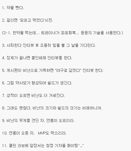 내가 야구선수면 그냥 스테로이드 빨고 몸키우고 말겠다 안걸리면 좋고 걸려도 시발 징계받고 다시 경기 나가서 성적만 좋으면 장땡인데