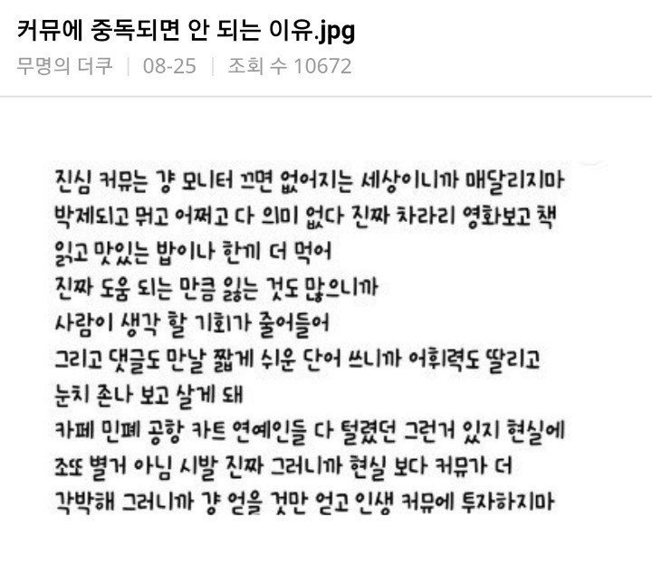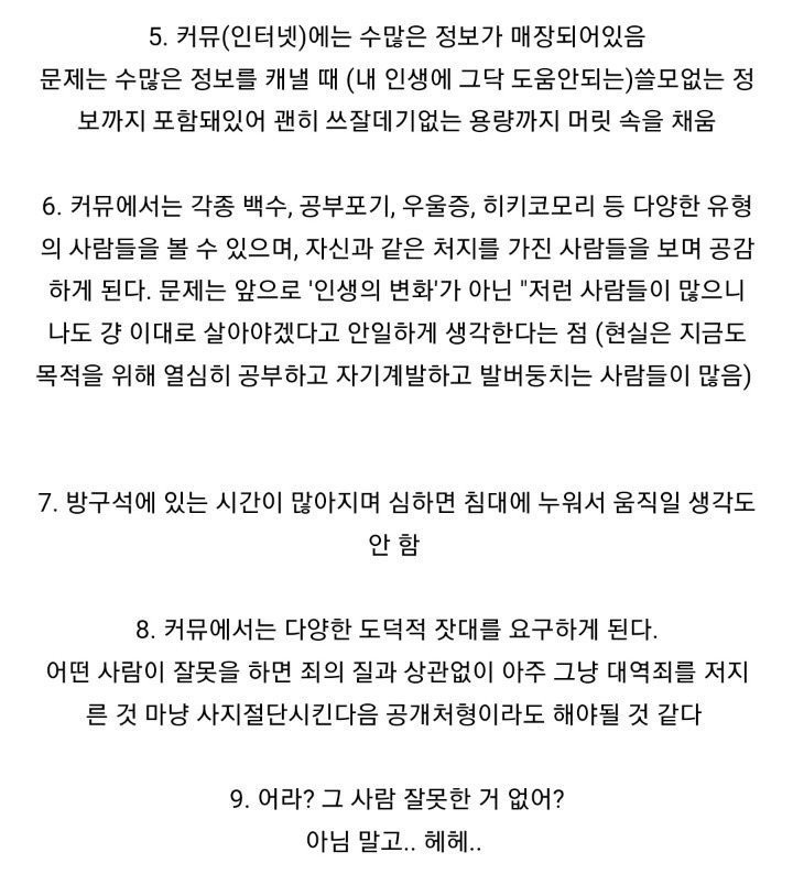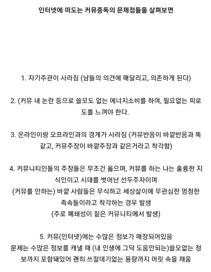 저기서 말하는 커뮤는, 주로 여덕들이 자기들끼리 모이는걸 커뮤라 함. 익명으로 만나느데, 그안에서 자기만의 캐릭터 만들거나 소설을 쓰거나 하는 그런걸 말함 그러다보니 현실감각이 떨어지는거지. 현실은 시궁창인데 커뮤에서는 잘나가는 나 니까