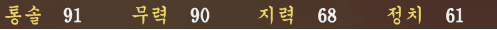 정치61(재평가후 50): 사실 군사령관을 맡은 인물의 정치가 먼 쓸모가 있겠냐만은 61이라는 수치는 대놓고 S급,A급 인물들의 서브스탯을 좀 더 잘 준수준밖에 안된다. 낮추는게 적당함