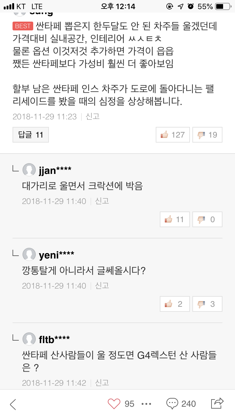 내가 친구한테도 말해줫는데 싼타페 타고 다니다 펠리보이면 보일때마다 빡치는건 맞음 한 5년 그럵득