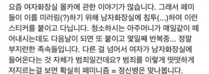 근데 솔직히 여자는 남자화장실 들어와도 별로 뭐라 안하지 않냐? 물론 남녀 바뀌면 잡혀가구요 시발 ㅋㅋ