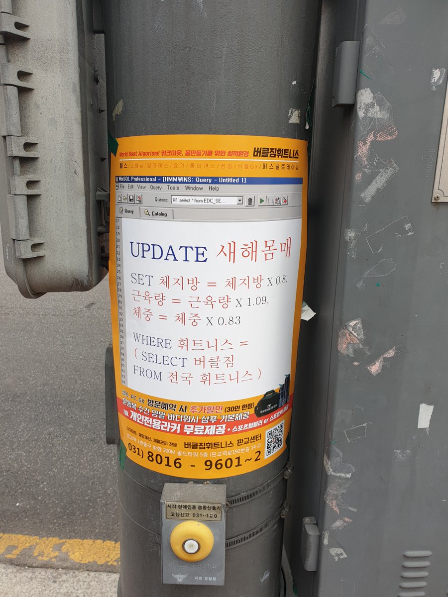 진지빨고 말하면 where 조건 설정이 이상한것 같다 새해몸매라는 테이블에 휘트니스라는 장소칼럼이 있다면 where 휘트니스 = 버클짐으로 어거지로 쓸수는 있을것 같긴하지만..