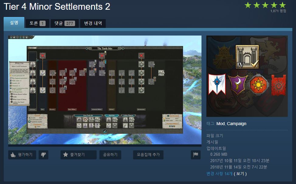 성이 아닌 정착지의 티어를 4까지 올릴 수 있는 모드로 4티어 건물들을 정착지에 건설할 수 있어서 추천