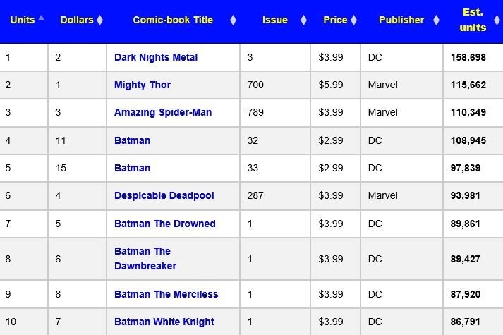 2017년 기준 코믹스 판매 순위. 그 뱃신이 다 처바르는게 문제. 그나마도 이게 마블 영화 개흥해서 많이 따라잡은건데도 이러함. 그전에는 10위권 안에 이름도 못 올린 해도 허다하다고 하니까.