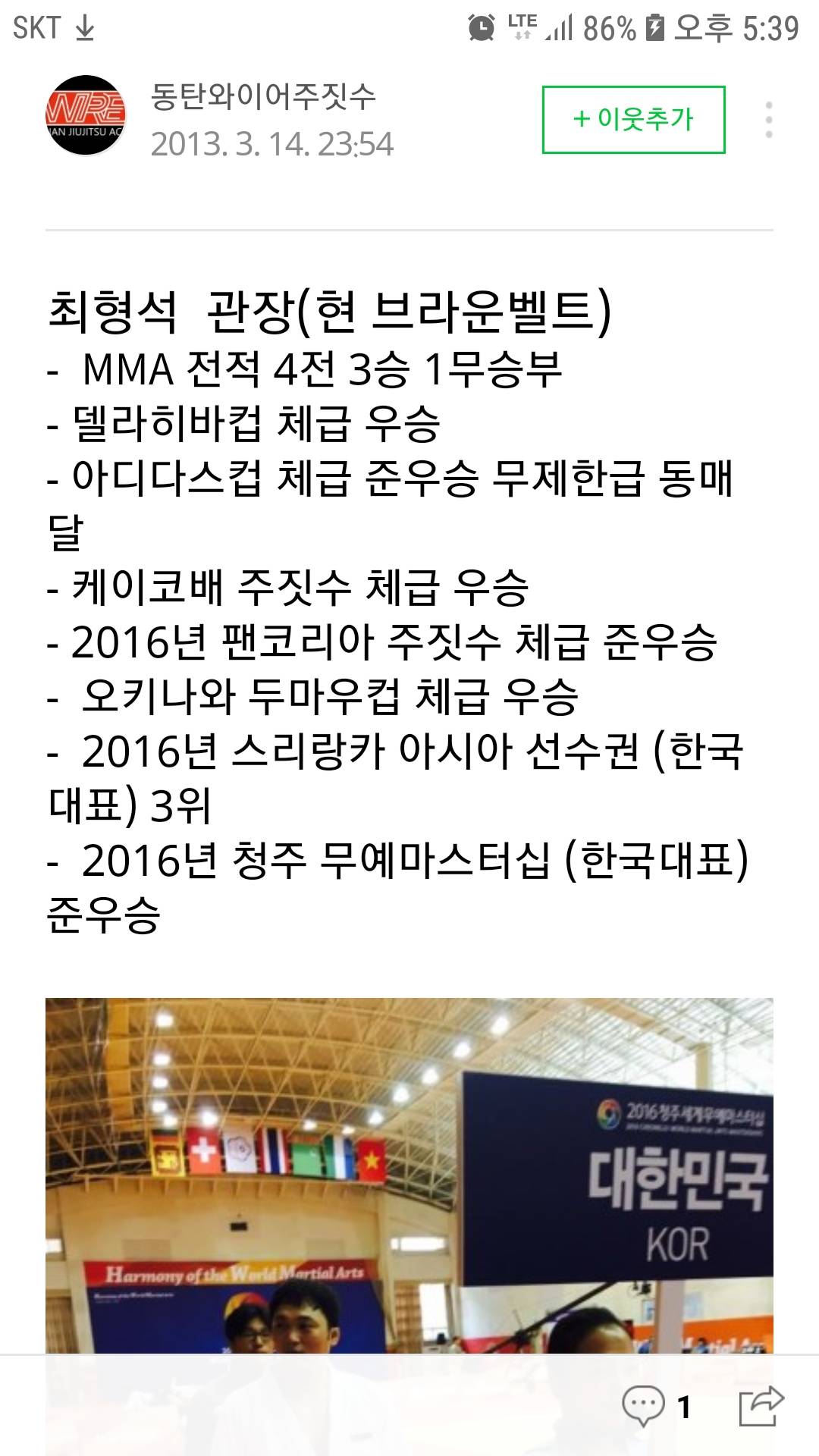 순결한중년// 미리 구경 가보는것도 괜찮고 ㅋㅋ. 체육관 갈떄는 요즘은 좀 적긴한데, 야매 도장들도 있어서, 되도록이면 팀이 좀 유명한곳으로 가는게 좋음. 쎈짐이나 동천백산 존프랭클 이런 계파가 있는곳이 좋고, 관장이 최소한 퍼플이상은 되는게 좋음. 요즘 막 오픈한다고 블루관장 있는 동네도 많아서.