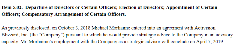 그는 27년 간 블리자드의 대표로 회사를 이끌었지만 작년 10월 '블리즈컨 2018'을 한 달 앞두고 대표직에서 사퇴, 회사 일선에서 물러나겠다는 소식을 발표했다. 마이크 모하임은 이후 액티비전 블리자드의 전략 고문으로 회사를 돕고 있지만, 그의 고문직은 채 6개월을 넘기지 못하게 될 수도 있다.